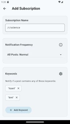 - Filter notification subscriptions by keyword. For example, if you want to receive notifications for /r/science where the title contains 'amphibian' or 'reptile' but not 'bird', you can!