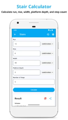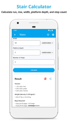 Concrete Calculator allows you to find 60 lb and 80 lb bag requirements. The app design is very simple, with clear user inputs and accurate results.