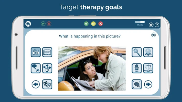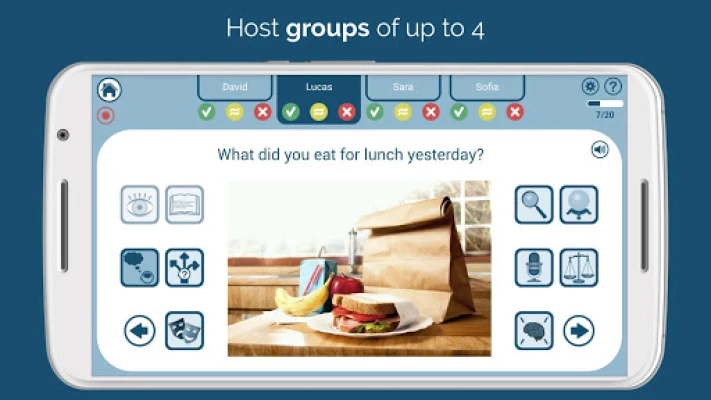 2) Start the conversation. Look at the picture, then touch any of the 10 buttons to see a question. The questions on the left are simpler (like “What is…?”) while the ones on the right are more complex (“How do you know…?”). Hear the question aloud, record your own audio, and score responses as you go.