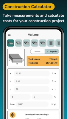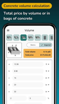 Concrete Calculator & Cost Estimator the construction calculator for contractors, builders and DIYers. Accurately calculate concrete volume in meters, yards, feet & inches, estimate concrete cost per unit, and obtain precise material quantities including bags of cement, sand and gravel. Whether you need a slab calculator, footing calculator, column or block wall estimator, this app simplifies on-site estimating and budgeting so you save time and avoid over-ordering.