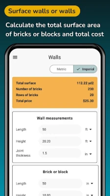Save time and avoid over-ordering, get precise budgets and material lists on site. Enter unit price per m³ or ft³ and the app returns a full construction cost estimate. Ideal for contractors, estimators and builders.